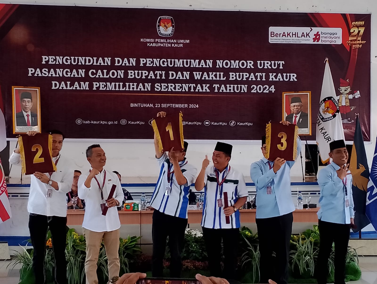Kaurinfo.com-Kaur, 23/09/24. Komisi Pemilihan Umum Daerah (KPUD) Kaur menggelar rapat pleno yang signifikan untuk pengundian dan pengumuman nomor urut pasangan Calon Bupati dan Wakil Bupati dalam Pilkada 2024. Acara ini berlangsung di Gedung Serba Guna Kab.Kaur dan dibuka secara resmi oleh Ketua KPUD Kaur, Bapak Muklis Aryanto, S.Kom., M.AP.