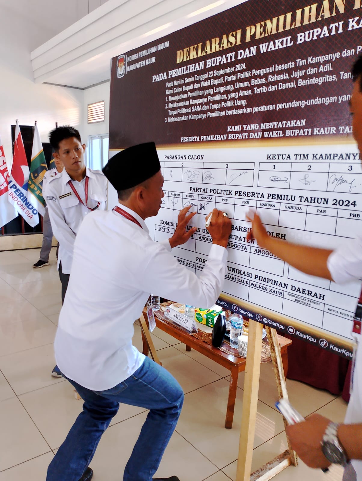Sebagai bagian dari agenda, KPUD Kaur menggelar deklarasi damai yang ditandai dengan penandatanganan papan deklarasi oleh Pasangan Calon, Tim Pemenangan, Partai Pengusung, serta Forkopimda. Kegiatan ini bertujuan untuk memastikan pelaksanaan pemilu yang aman dan kondusif.
